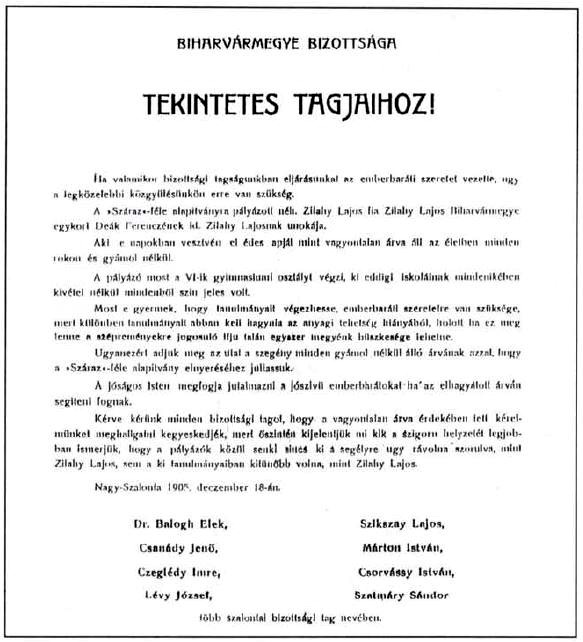 kiváló tanuló Zilahy Lajos pártfogását kérő röplapot, miben szülőhelye