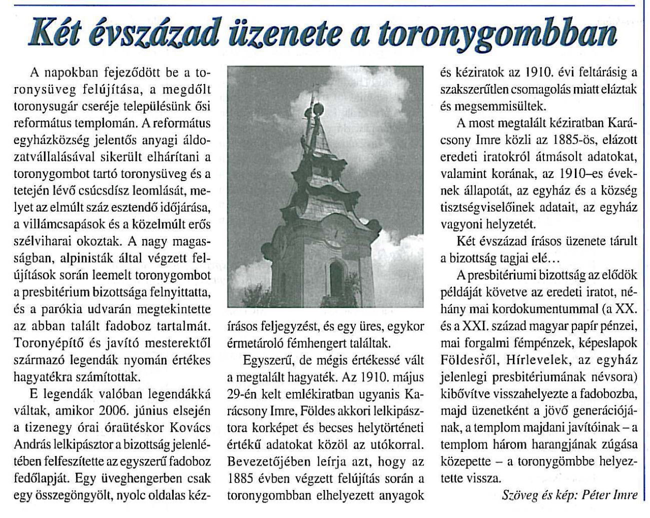 Imre lelkész 1910-es Emlékirata a torony gombjában.